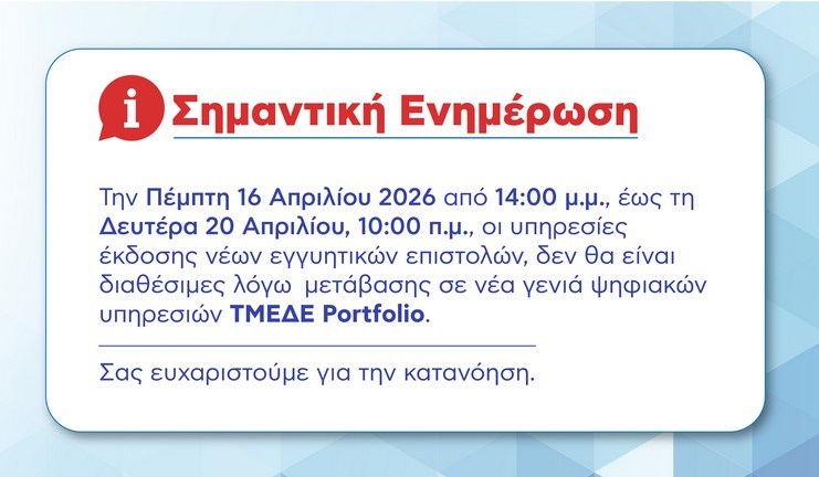 Σημαντική ενημέρωση ΤΜΕΔΕ για μη διαθεσιμότητα των υπηρεσιών έκδοσης νέων εγγυητικών επιστολών, από 16.04 ώρα 14.00 μ.μ. έως 20.04 ώρα 10.00 π.μ., λόγω αναβάθμισης.