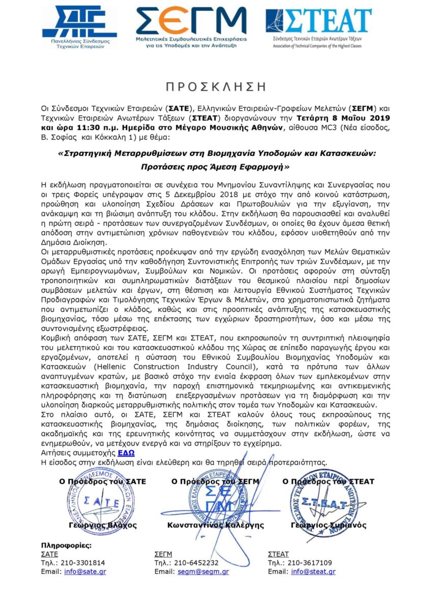 Λοιπές Πληροφορίες: Πρόσκληση – Πρόγραμμα, Δήλωση Συμμετοχής, Έντυπη Δήλωση Συμμετοχής, Διοργάνωση, Βιογραφικά Εισηγητών, Δελτίο Τύπου, Φωτογραφικό Υλικό, Εισήγηση κας Χ. Χαραλαμποπούλου, Εισήγηση Προέδρων ΣΑΤΕ, ΣΕΓΜ, ΣΤΕΑΤ, Εισήγηση κ. Σ. Λαμπρόπουλου, Εισήγηση κ. Γ. Συριανού, Εισήγηση κ. Ι. Οικονομίδη, Ομιλία κ. Ι. Οικονομίδη, Εισήγηση κ. Ε. Βράιλα, Μνημόνιο Συναντίληψης και Συνεργασίας, Δελτίο Τύπου, Συνέντευξη κ. Κ. Καλέργη